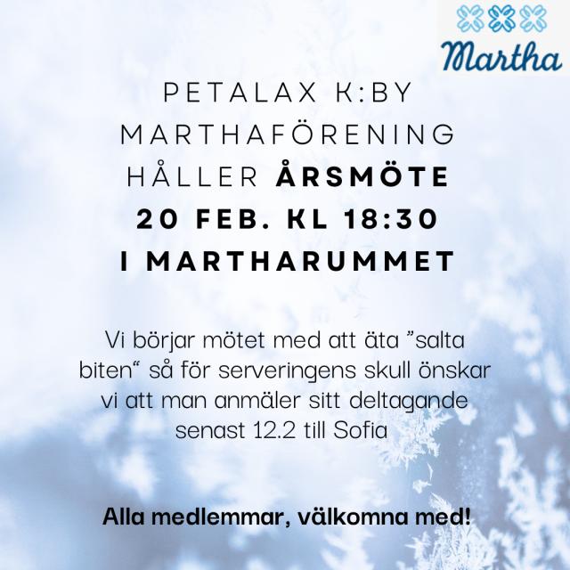 Får föreningen grundades år 1904 och har idag ca 30 medlemmar, varav kretsen Petalax Märthorna utgör 11 st. Vi träffas ungefär en gång i månaden. Mötena hålls till största del i vårt eget Martharum i uf-lokalen.