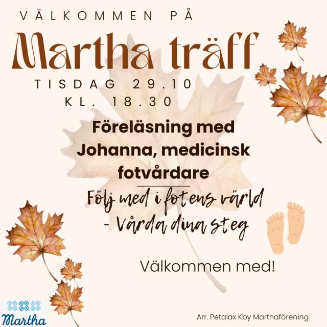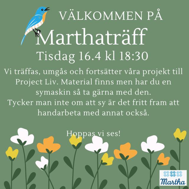 Verksamheten är varierande, men trogna inslag är de traditionella månads-träffarna och sommarens utfärd. Sommarutfärden går till intressanta utflyktsmål som man når under en dag. När vi har våra träffar i Martharummet är två marthor värdinnor och förutom kaffe med gott dopp brukar vi ha något speciellt tema som vi samlas kring. Vi satsar mycket på samarbete över generationsgränsen.